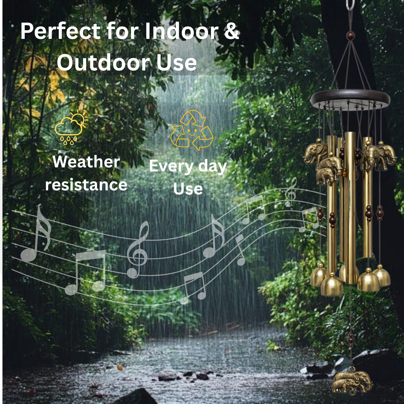 wind chain for home decoration. Made from durable wood and shining golden metal, it features 6 elephant charms, 4 bells, 4 golden pipes, and a fiber ball. The combination of these elements creates a soothing sound with every breeze, making it ideal for balcony, garden, living room, or door decor. This wind chime with bells and pipes not only enhances your home’s look but also invites peace, positivity, and good luck. A perfect piece of metal wind chime decor for both indoors and outdoors.